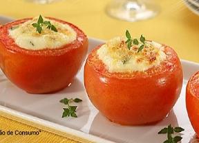 Corte uma tampa da parte superior de cada tomate e retire as semente. Vire sobre uma peneira, deixe escorrer e polvilhe sal e pimenta-do-reino dentro dos tomates. Misture o queijo cremoso com a cebola, o alho, o manjericão e o azeite. Recheie os tomates com essa mistura e polvilhe com queijo parmesão ralado. Transfira os tomates para um refratário (sem tampar) e leve ao micro-ondas por 3 minutos na potência alta (100%). Deixe descansar por 2 a 3 minutos e sirva a seguir.